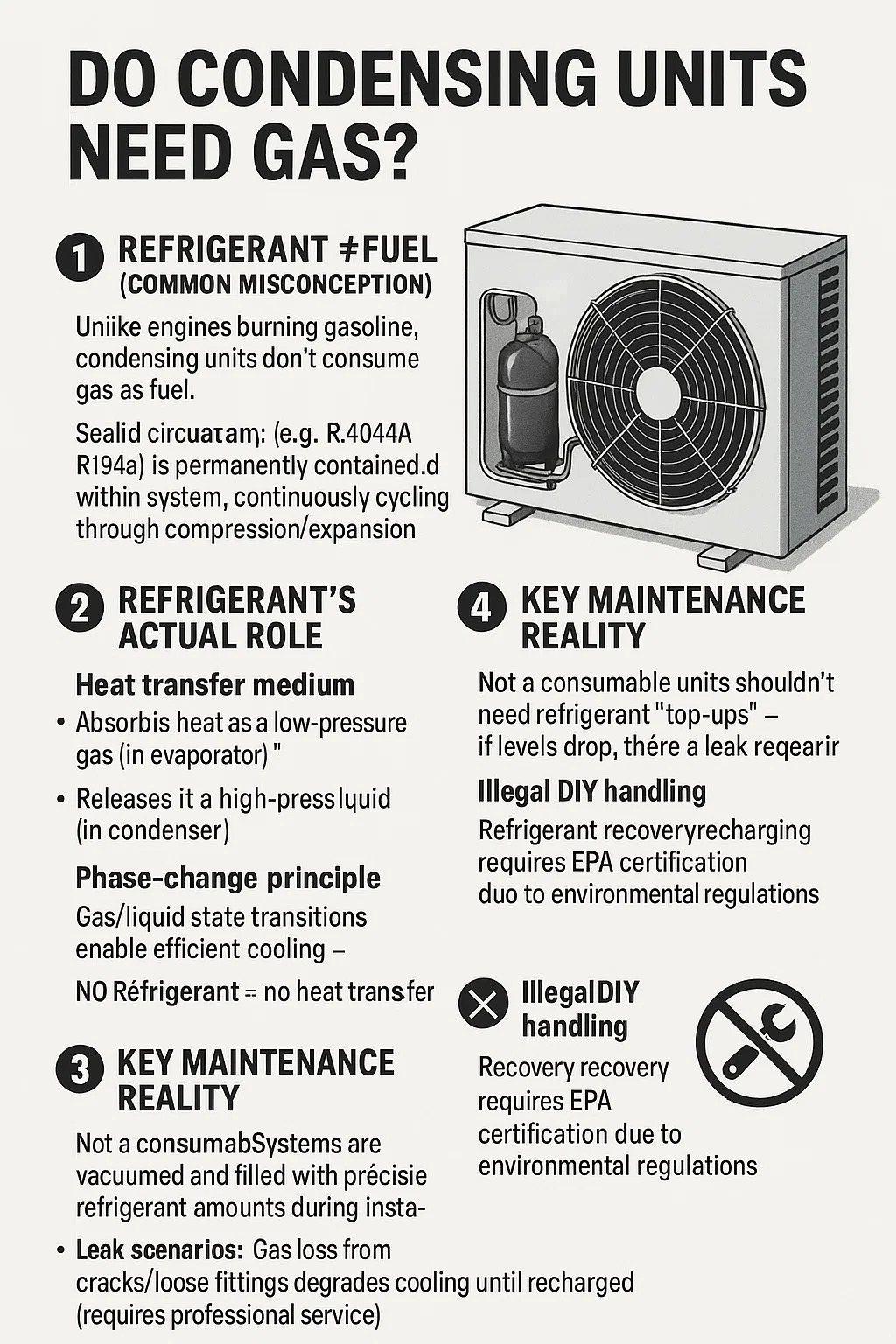 Inga, kondensationsenheter själva "behöver inte gas" - men deras kylkrets kräver absolut kylmedelsgas för att fungera. Här är den kritiska uppdelningen: