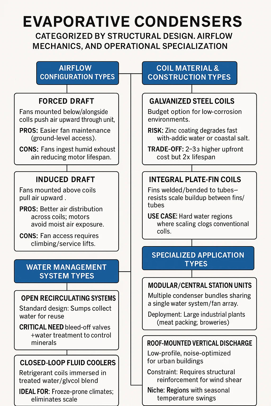 Förångande kondensorer är kategoriserade efter strukturell design, luftflödesmekanik och operativ specialisering. Nedan följer en fältfokuserad uppdelning av vanliga typer:
