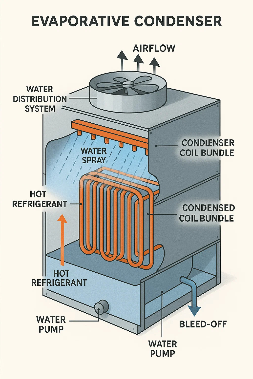 En avdunstningskondensor Integrerar luftkylning och vattenindunstning för att avvisa värme från kylsystem. Dess design och drift skiljer sig grundläggande från standard luftkylda kondensatorer: